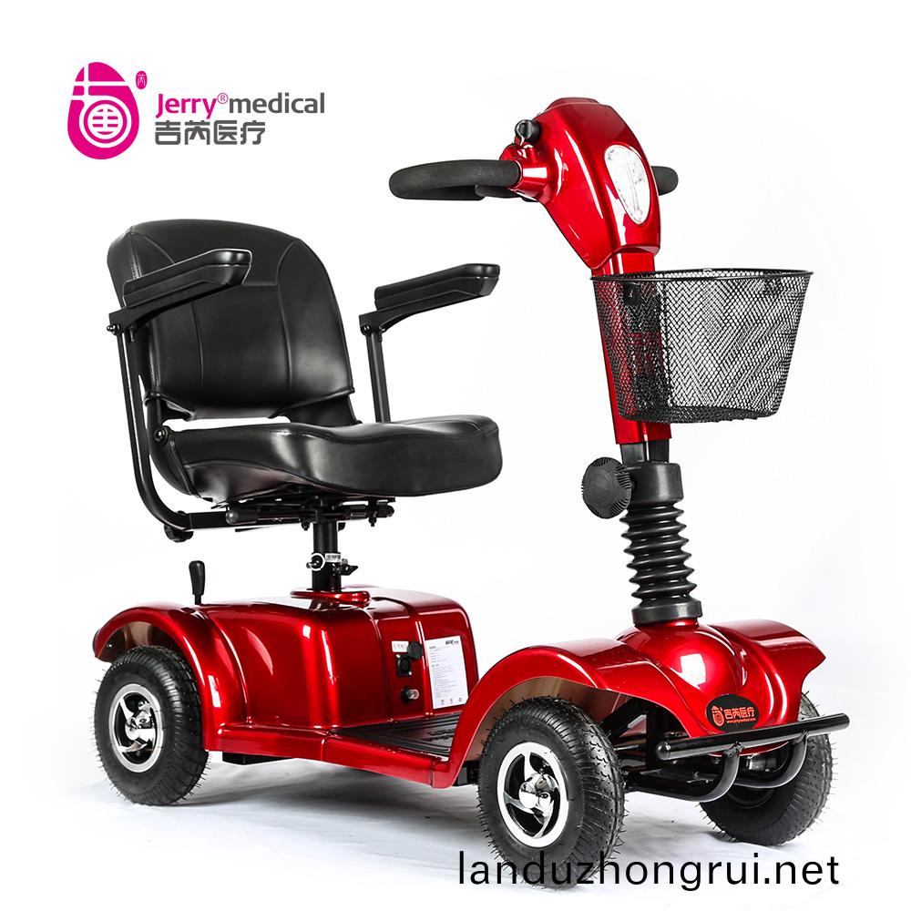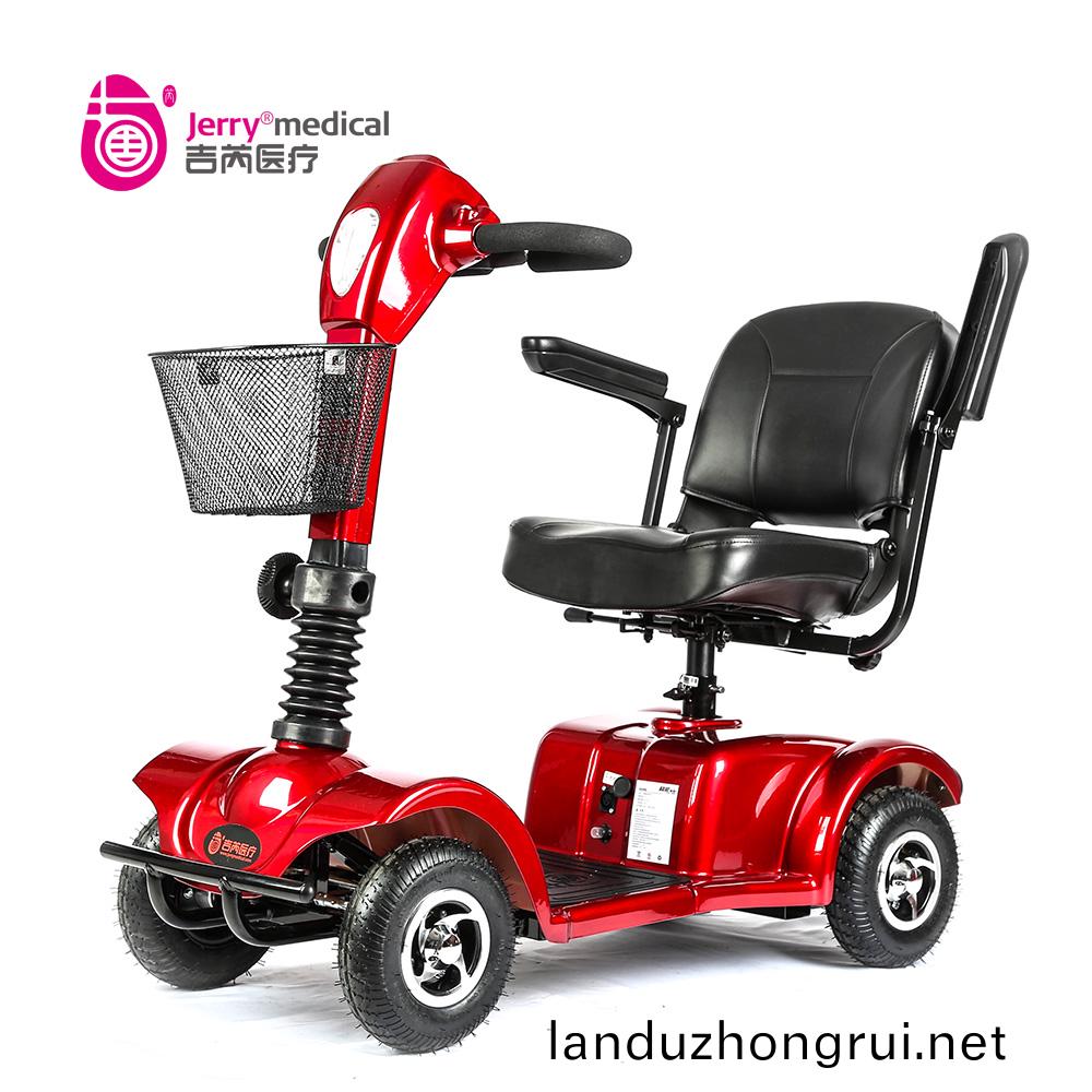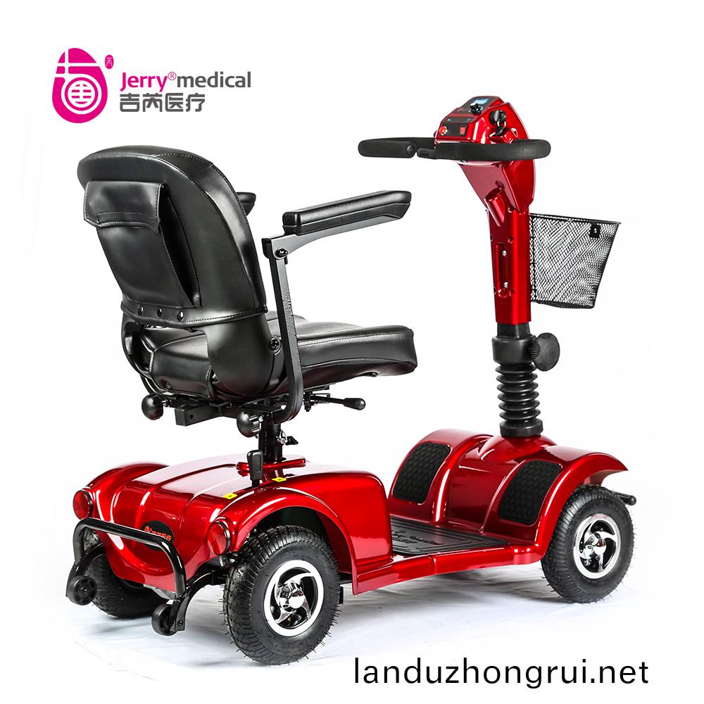 吉芮医疗代步车,可掀扶手,移动调节扶手间宽度,可调节座椅高度,标准轻型靠背,可折叠式海绵座椅,座椅可转动,可调节方向杆角度,全自动电磁刹车。
