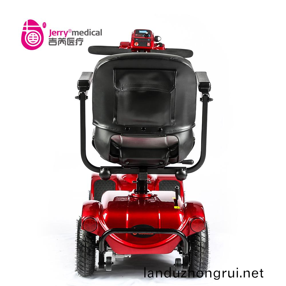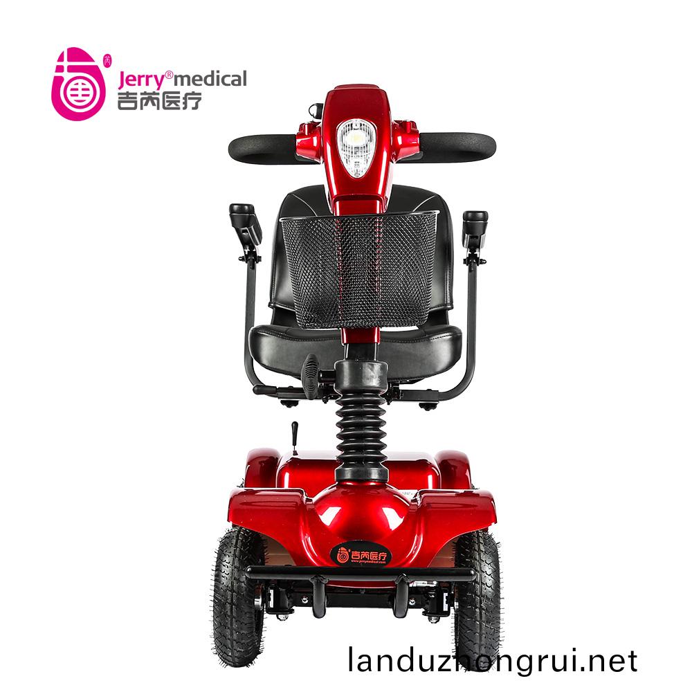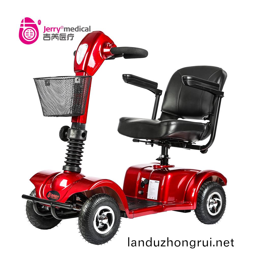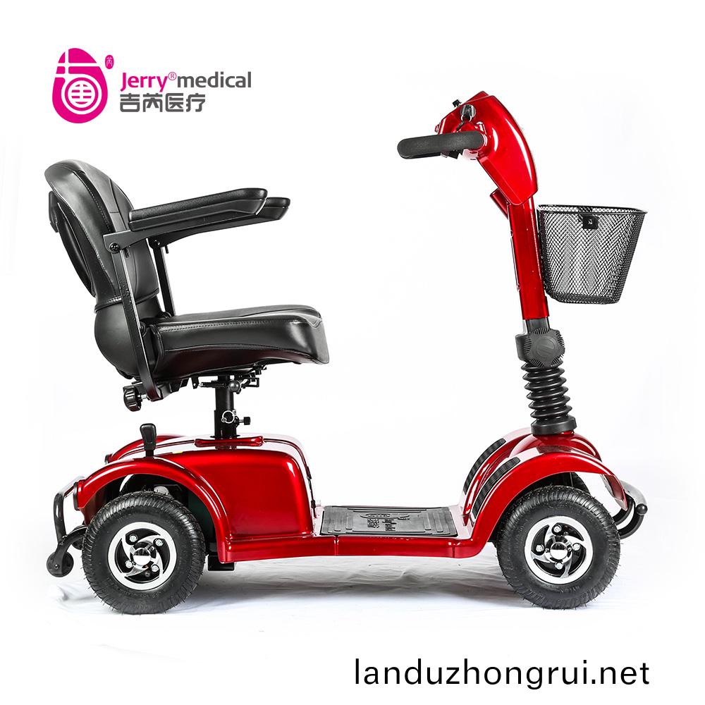 吉芮医疗代步车,可掀扶手,移动调节扶手间宽度,可调节座椅高度,标准轻型靠背,可折叠式海绵座椅,座椅可转动,可调节方向杆角度,全自动电磁刹车。