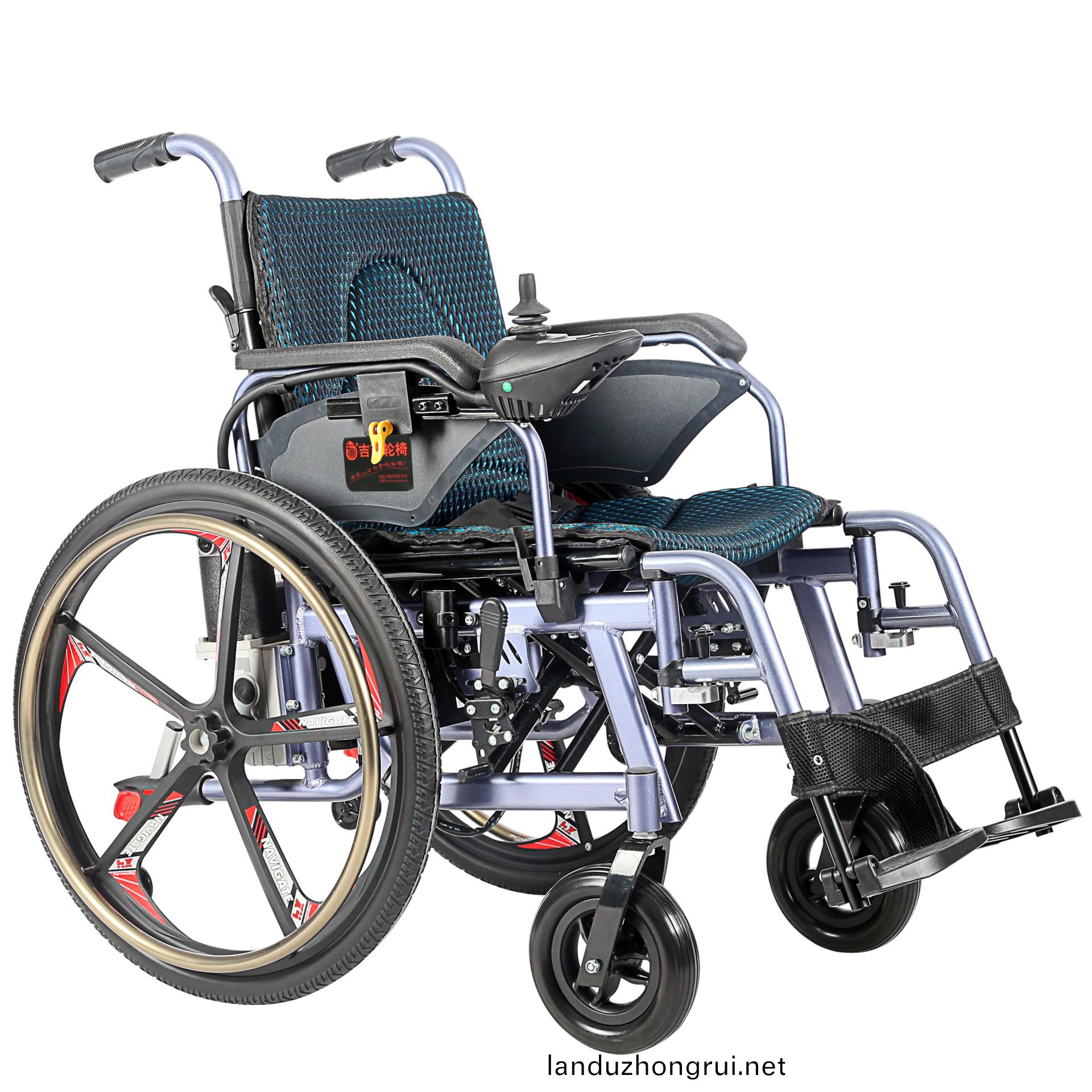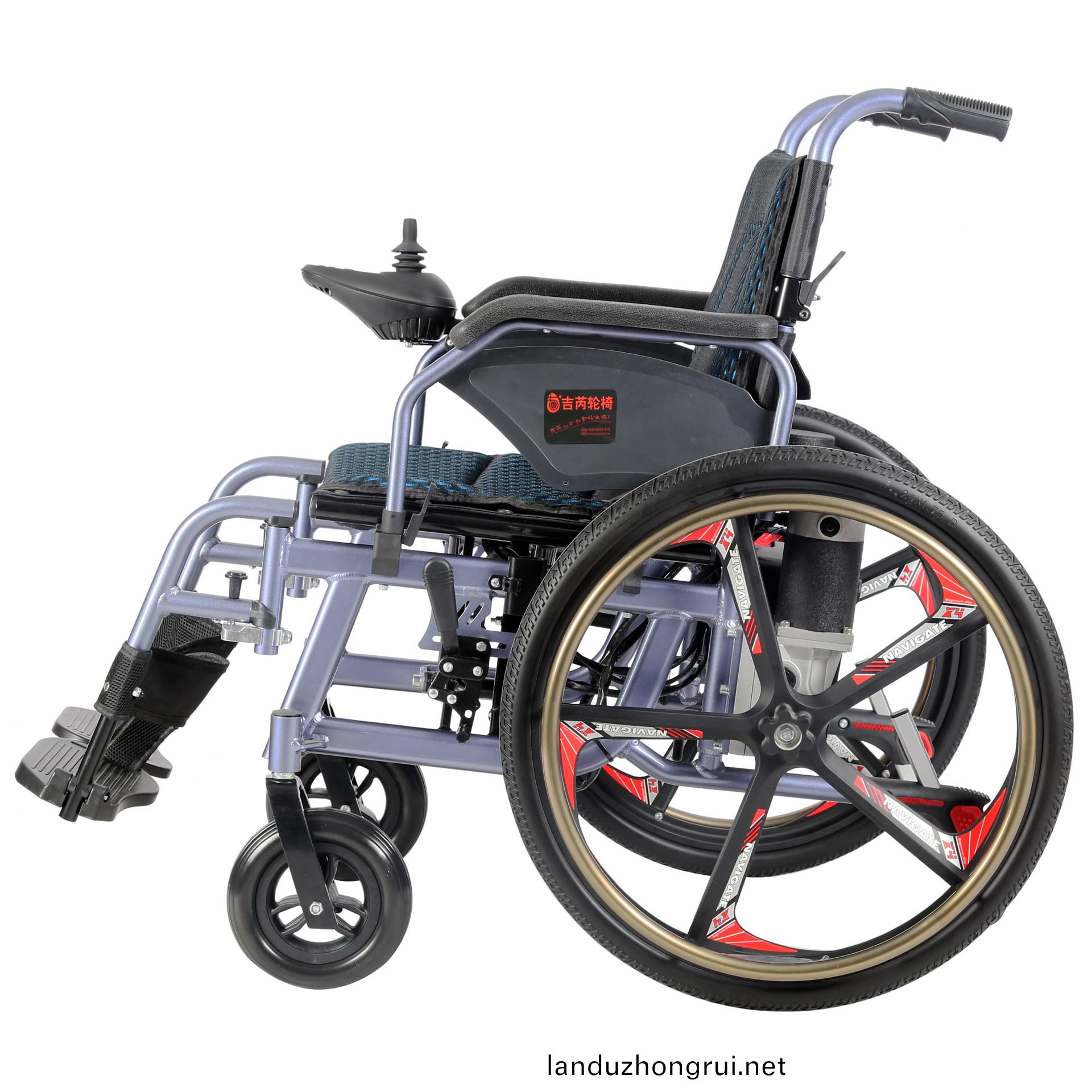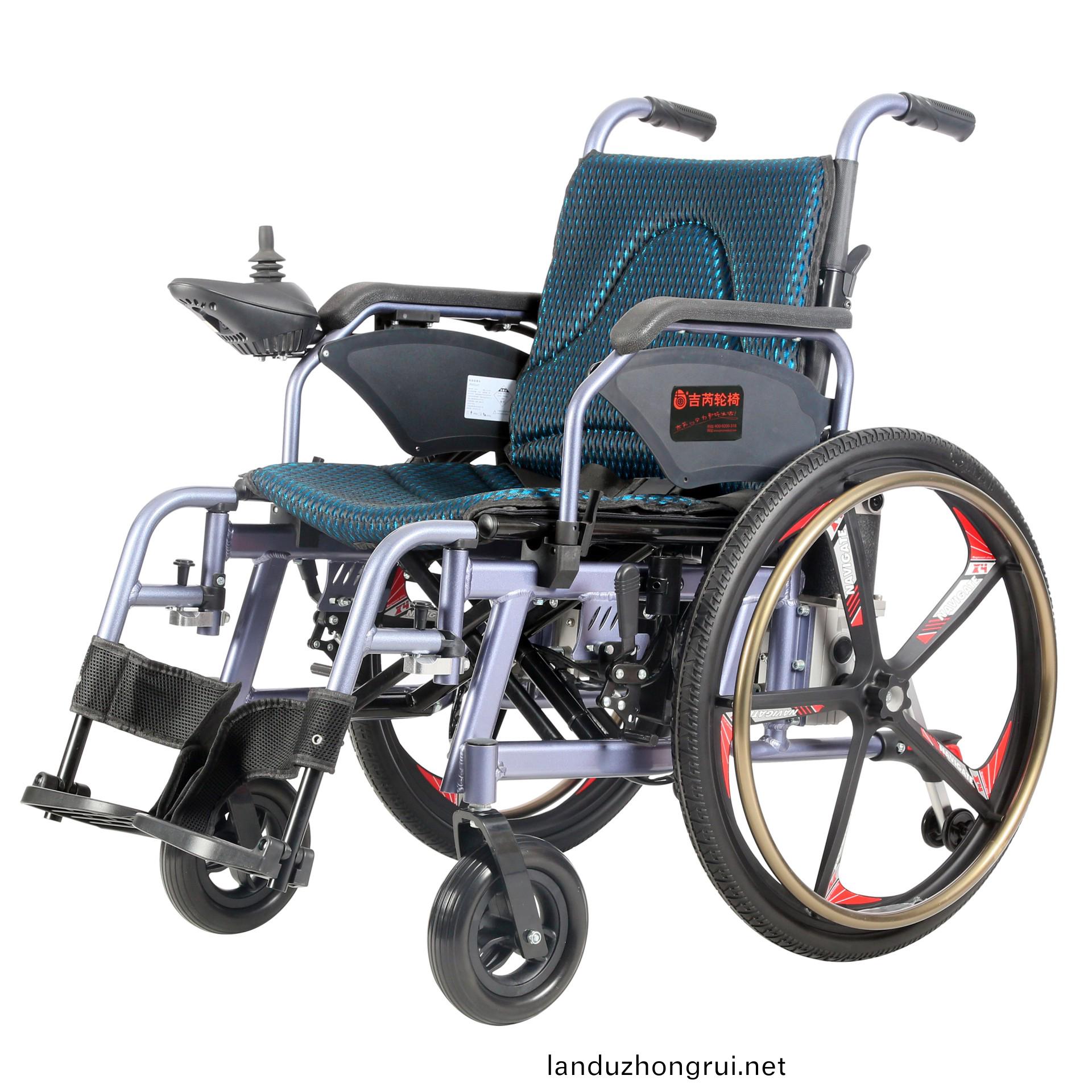 吉芮医疗电动轮椅,铝合金车架、轻便、易于携带,手动/电动两用,可折叠,可掀扶手,可调节可拆卸跨脚,控制器左右手可互换,采用台湾蜗轮蜗杆马达,全自动电磁刹车。