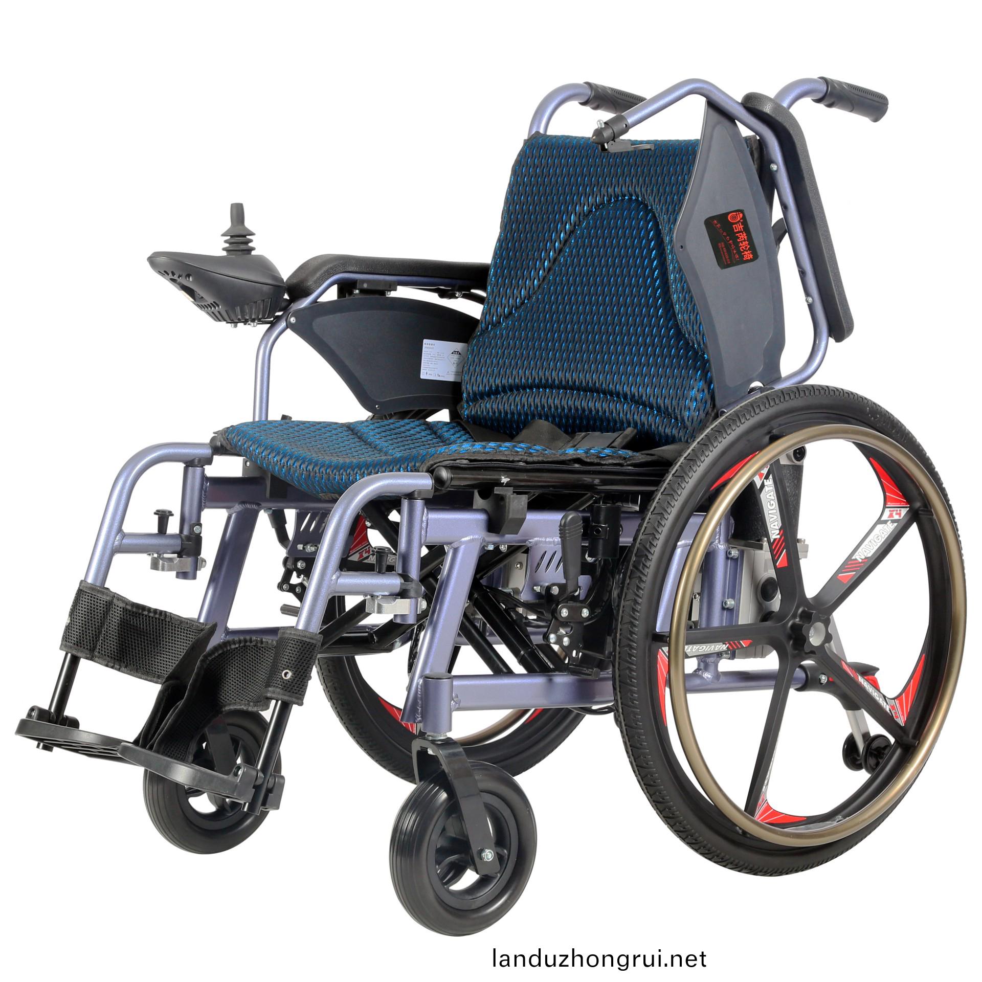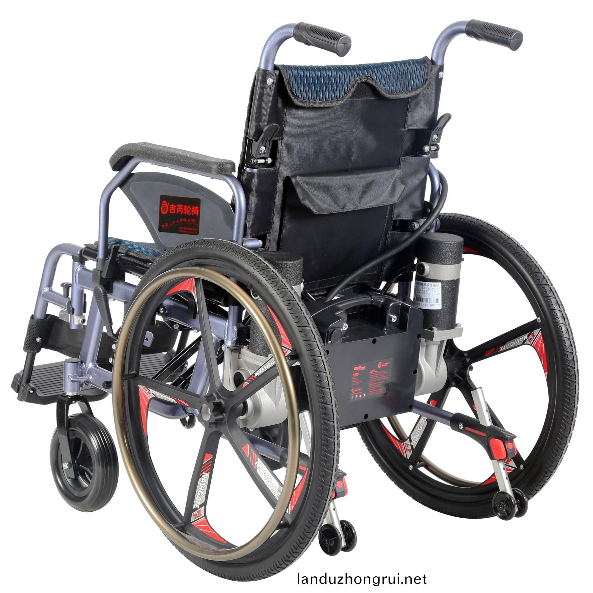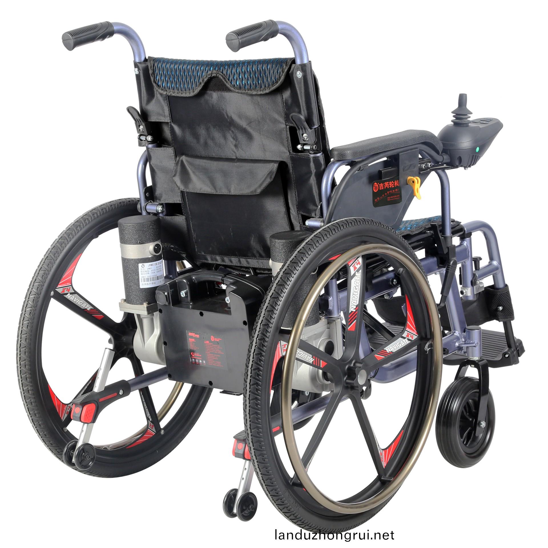吉芮医疗电动轮椅,铝合金车架、轻便、易于携带,手动/电动两用,可折叠,可掀扶手,可调节可拆卸跨脚,控制器左右手可互换,采用台湾蜗轮蜗杆马达,全自动电磁刹车。