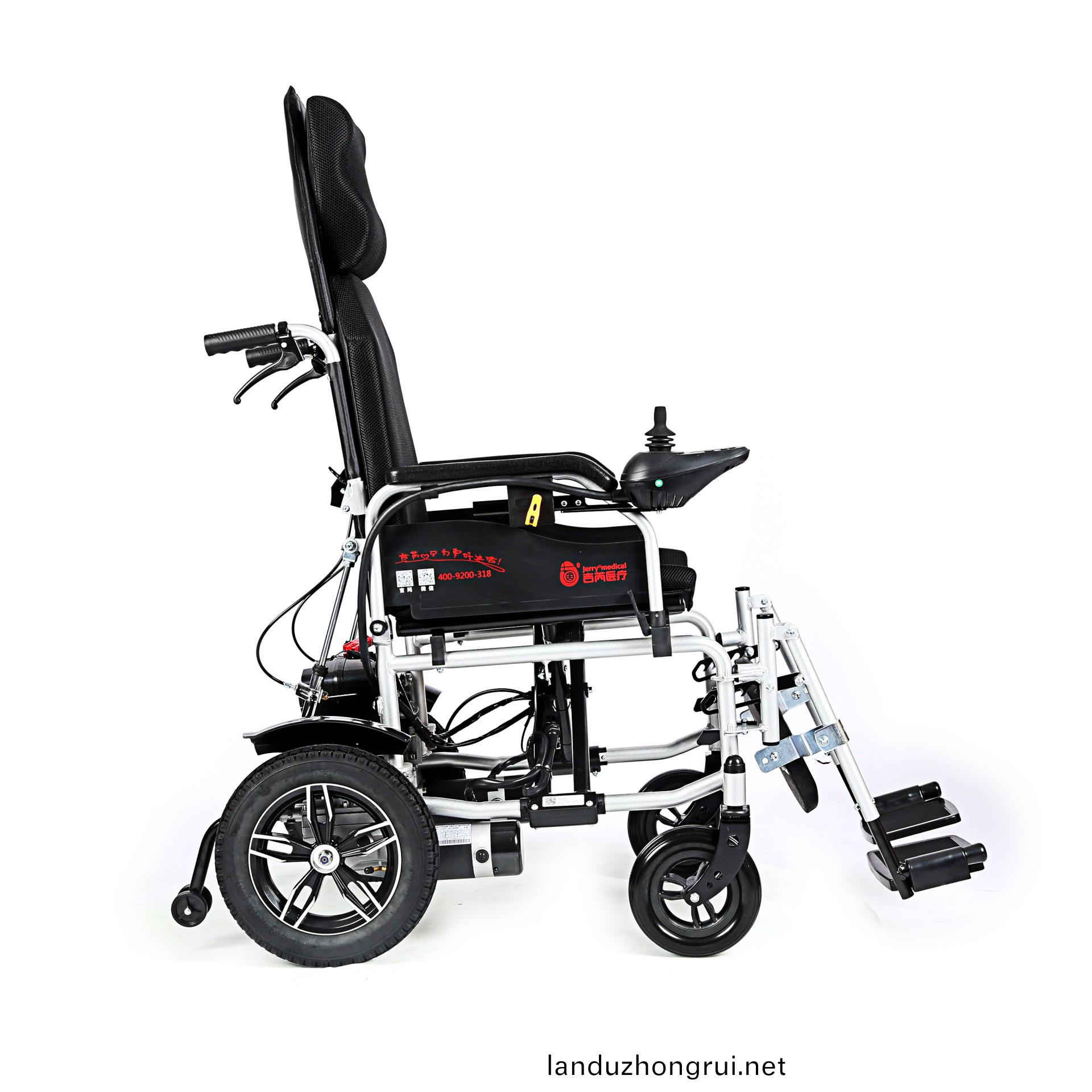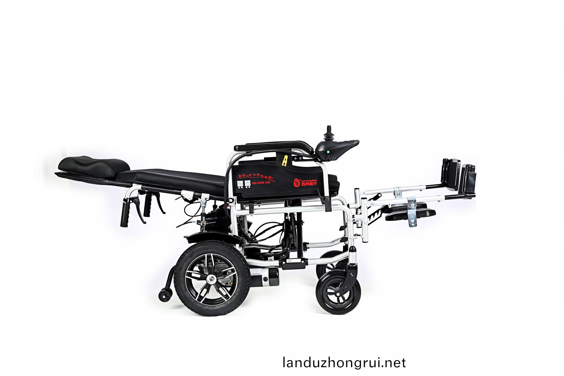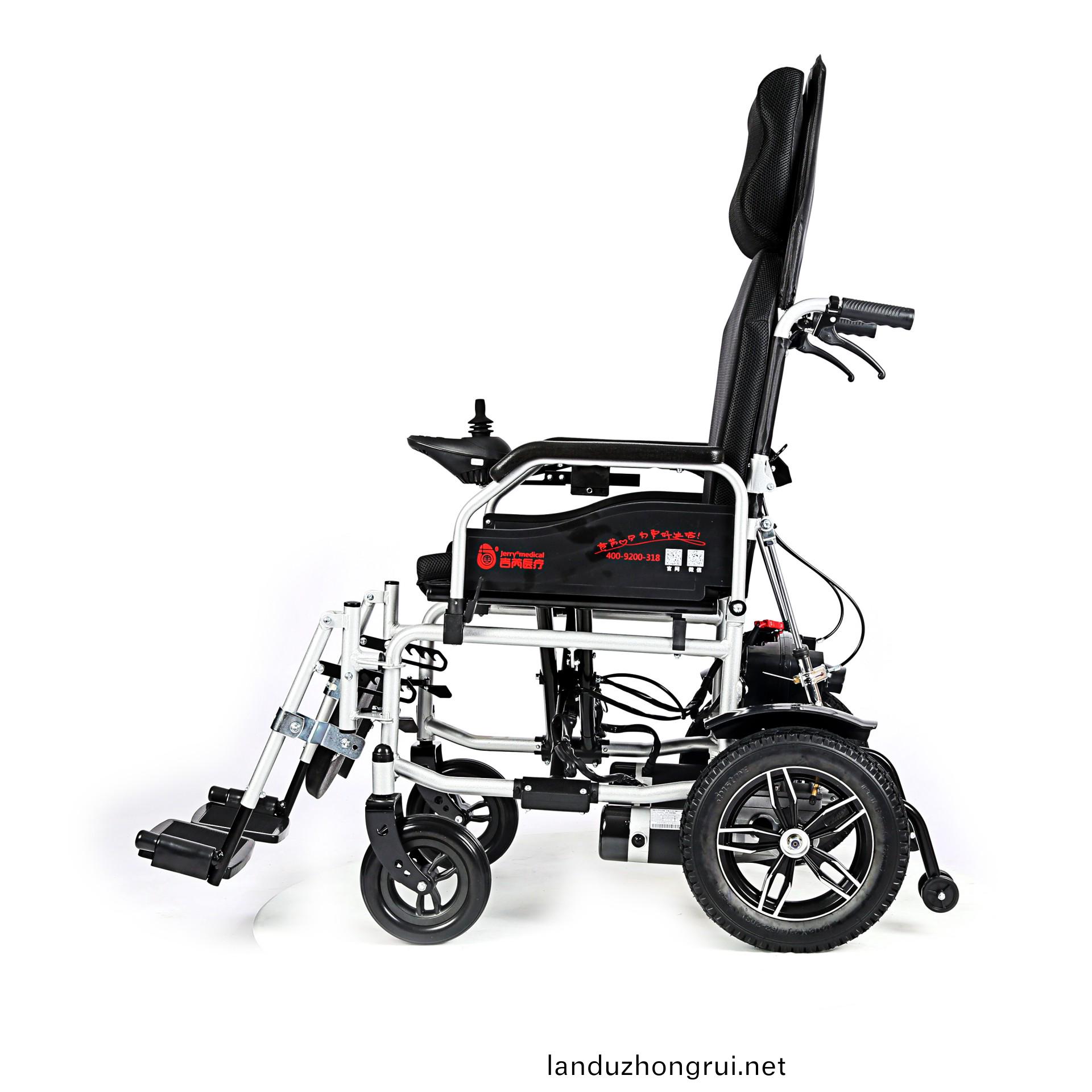吉芮医疗电动轮椅,易于携带,可折叠,可掀扶手,可调节可拆卸跨脚,控制器左右手可互换,采用台湾蜗轮蜗杆马达,全自动电磁刹车,可手动抬腿,手动靠背。